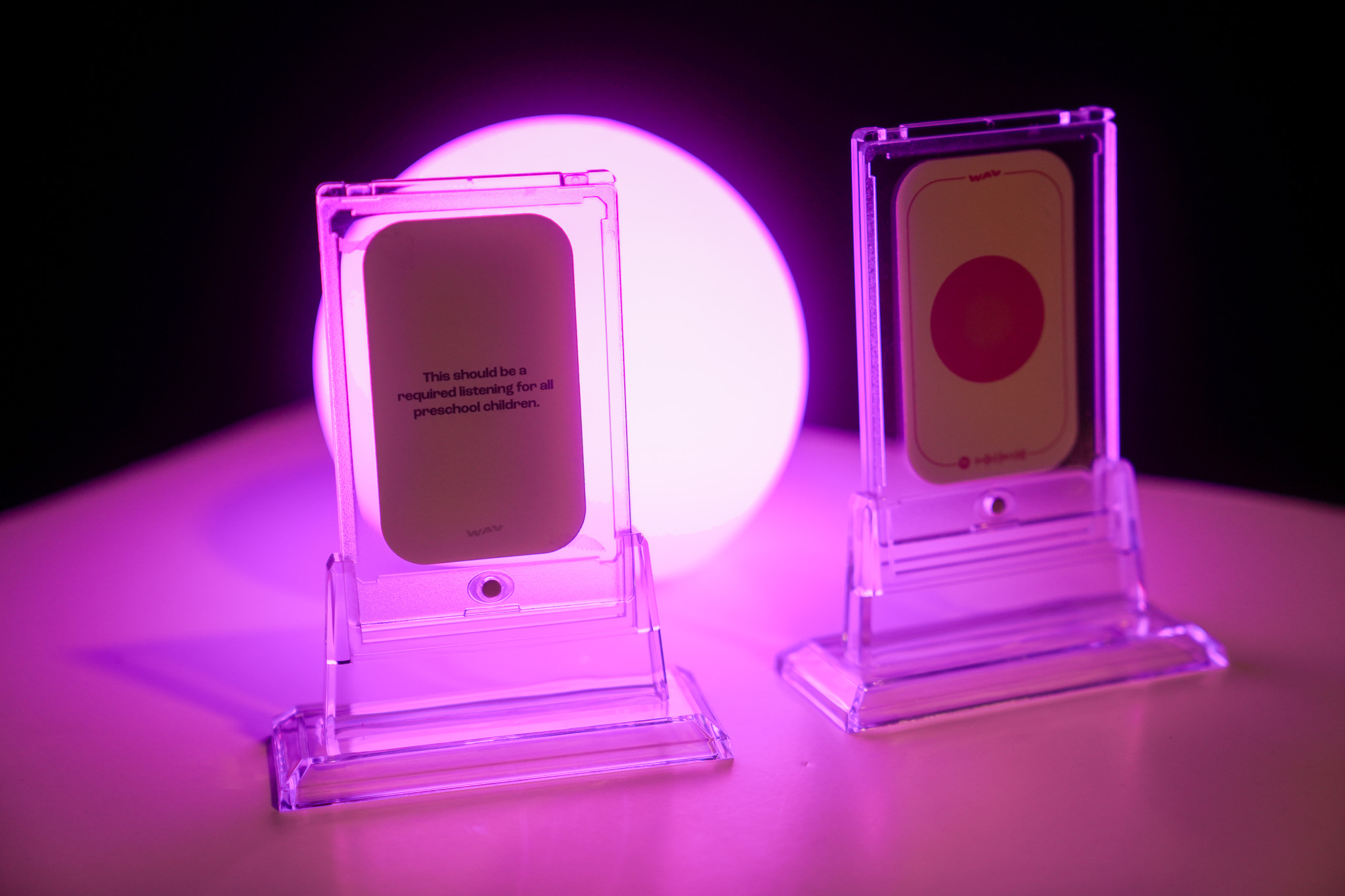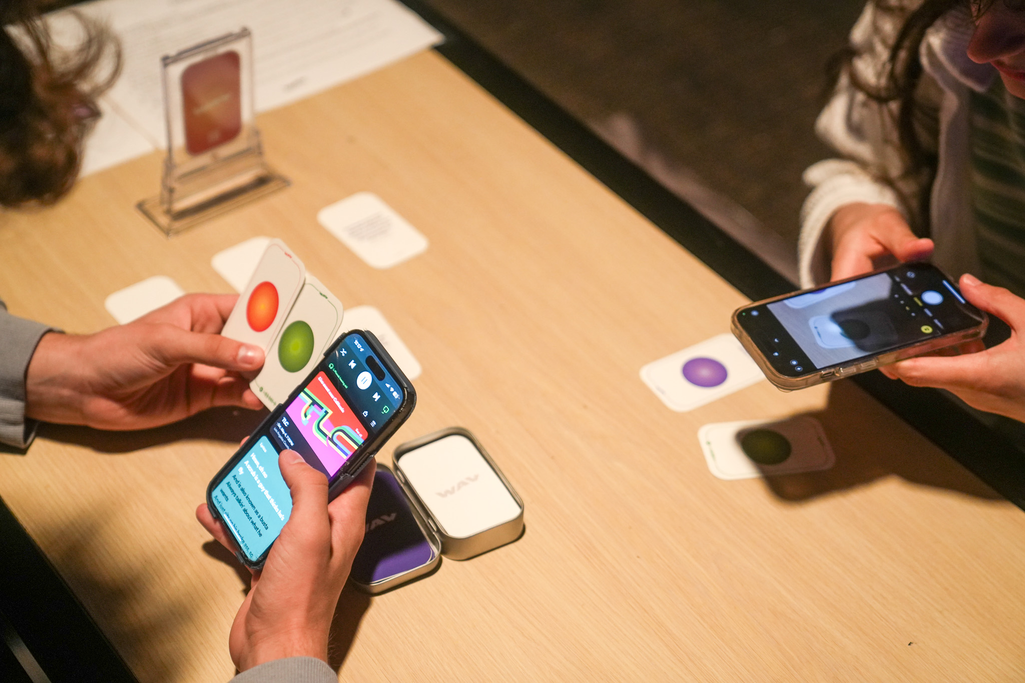 WAV is a physical card game consisting of “song” cards and “prompt” cards, in addition to a website platform. Each song card features the name of the song, artist, and a scannable Spotify code that leads to a digital version of the song. The objective of the game is to place one song card down that the player deems appropriate to the prompt, and one chosen member of the group determines which song best represents the prompt each round, thus determining the winner of the round. The game requires players to use headphones to listen to the song cards they pull, or play them out loud, which facilitates the music discovery process. The game is paired with a website that features articles, playlists, and resources to enhance the music discovery process while at the same time educating those who are interested in various topics including artist case studies, background on the digital age of music, breakdowns of samples, and history of specific genres of music.