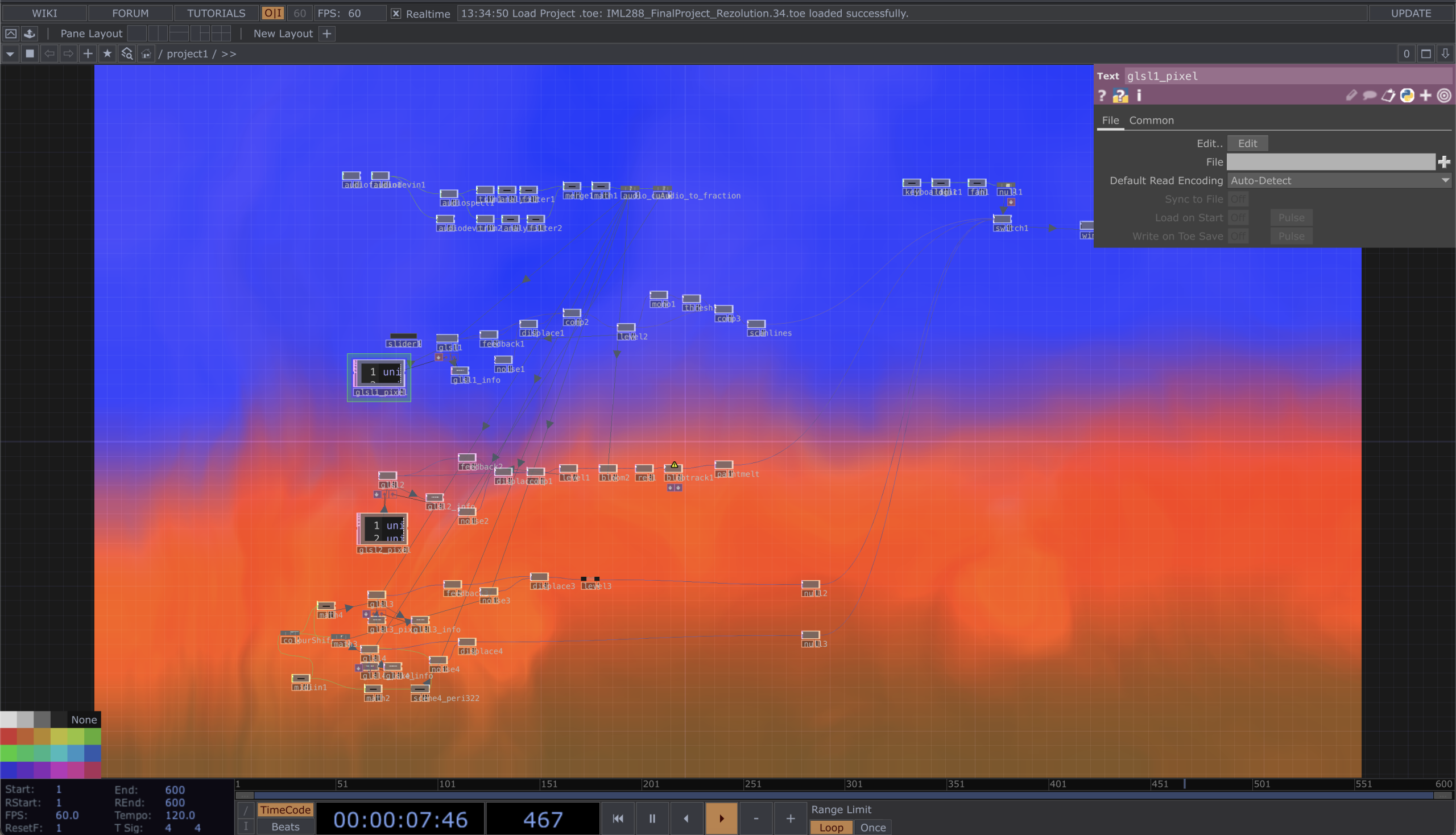Completed for IML288: Introduction to Creative Coding. "Rezolution" is an audiovisual performance that contemplates concepts of abstraction, colour, and resolution. Visually, it takes on the essence of Mark Rothko's colour field paintings and merges it with digital and procedural processes of image generation. Each scene was coded as a GLSL shader and manipulated live through MIDI data and TouchDesigner.